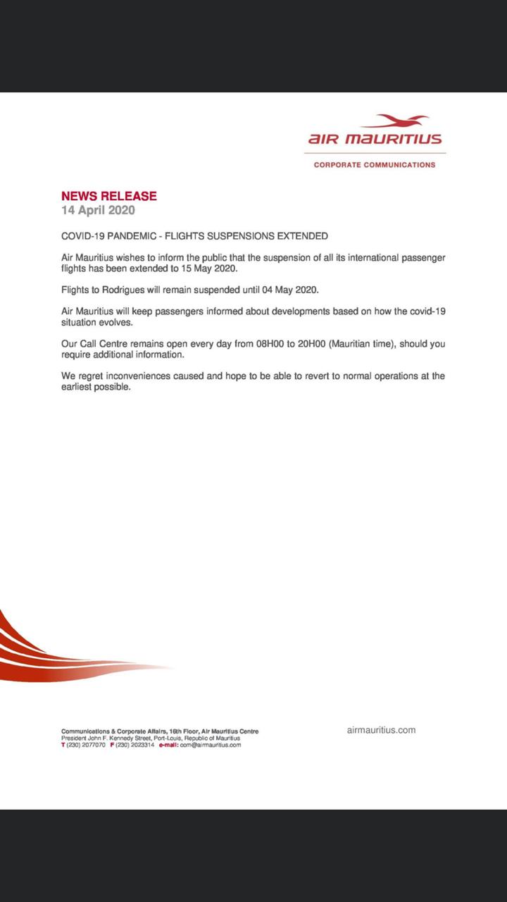 Air Mauritius wishes to inform the public that the suspension of all its international passenger flights has been extended to 15 May 2020.